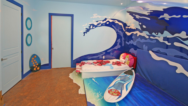 “The Surfing Room — Paige decked out the walls and floors to make us feel like we’re in the ocean. Ryanne and Haydn even have a surfboard that links to a surfing game in their room. Hang ten, kids!”